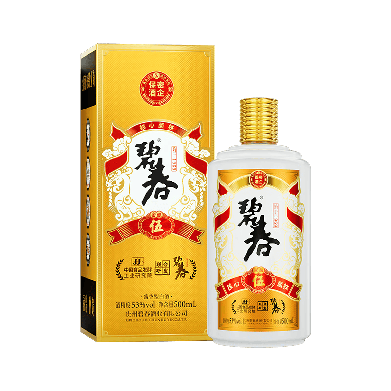碧春伍酱香型白酒,酒精度53度,采用核心保密菌株酿造,具有地道的茅香味。作为贵州老字号,碧春伍酱香白酒荣获轻工所赠的16株核心菌株,并与中国食品发酵工业研究院联合共建产业新高地。品牌还得到了央视推荐报道的公开背书,确保了其品质与口碑。